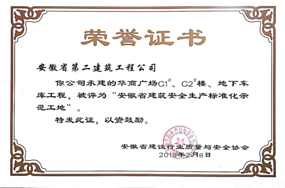 由三分公司承建的華商廣場C1、C2#樓、地下車庫項目與2018年2月8日正式被安徽省建設(shè)行業(yè)質(zhì)量與安全協(xié)會評為“安徽省建筑安全生產(chǎn)標(biāo)準(zhǔn)化示范工地”稱號,近日正式授牌。