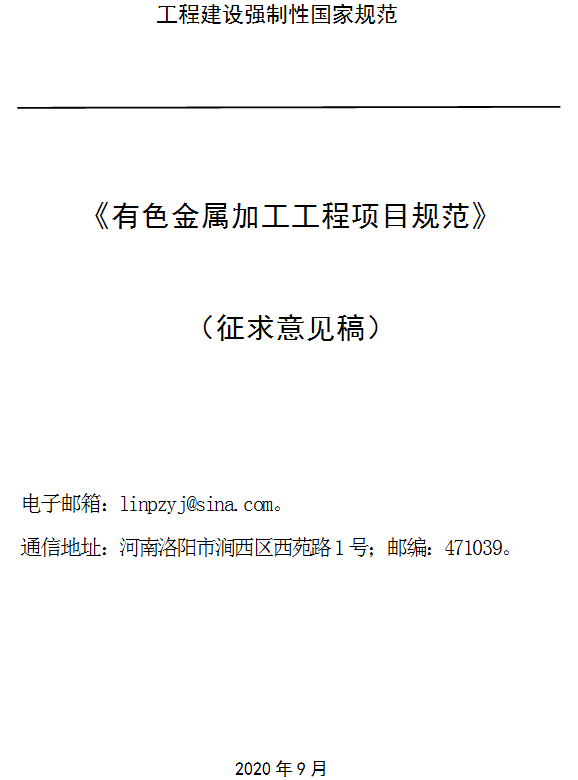 《有色金屬加工工程項(xiàng)目規(guī)范(征求意見(jiàn)稿)》