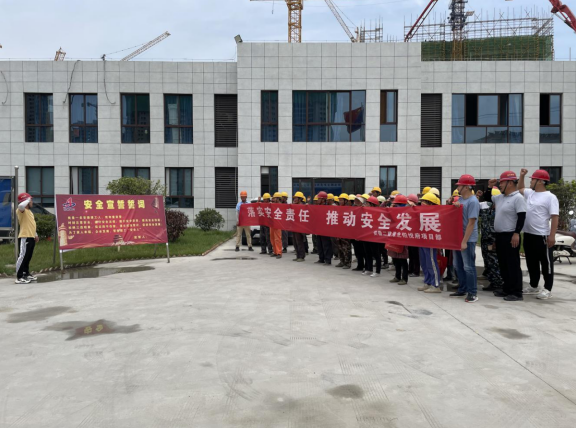 安全負(fù)責(zé)人趙志文帶領(lǐng)全體人員進(jìn)行安全宣誓。項(xiàng)目經(jīng)理徐良帶領(lǐng)全體人員在以“落實(shí)安全責(zé)任,推動(dòng)安全發(fā)展”為主題的橫幅上簽名。