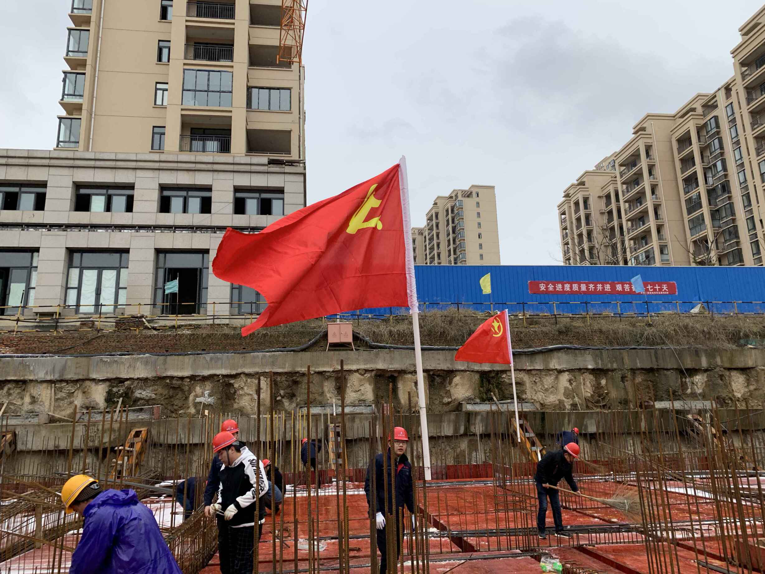 8日,大雪紛紛揚揚下了一天,為更好的激勵各班組保安全、促生產(chǎn)。在項目黨支部和共青團的帶領(lǐng)下,管理人員與班組工人一同綁扎鋼筋。雖然雪花飛舞,寒風刺骨,但大家無一人退縮,綁扎鋼筋超過了工人擺放鋼筋的速度。