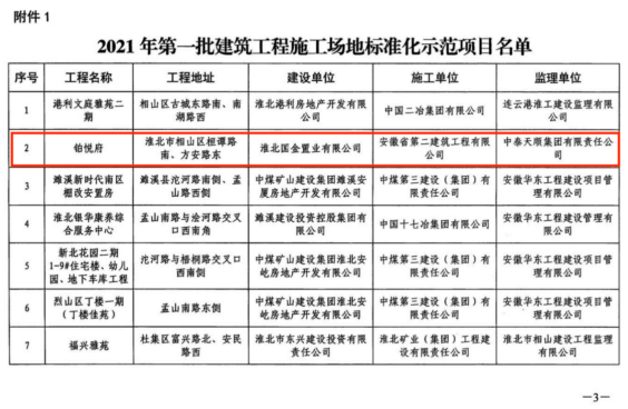 11月2日,淮北市住房和城鄉(xiāng)建設(shè)局、淮北市生態(tài)環(huán)境局公布了第一批淮北市“建筑工程施工場地標(biāo)準(zhǔn)化示范項(xiàng)目”名單,安徽二建第一分公司淮北鉑悅府項(xiàng)目在考核評(píng)價(jià)過程中,達(dá)到優(yōu)良等級(jí),被評(píng)為2021年淮北市第一批建筑工程施工場地標(biāo)準(zhǔn)化示范項(xiàng)目。