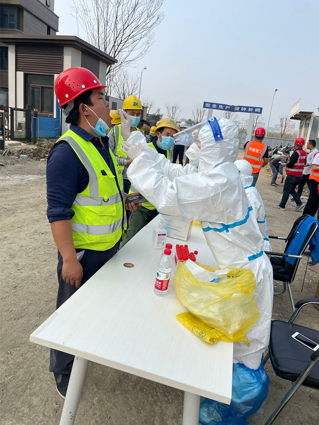 為配合做好核酸檢測工作,項目青年志愿者在現(xiàn)場維持秩序、設(shè)置點位、劃分區(qū)域,按10人為一組配合醫(yī)護人員采集咽拭子。醫(yī)護人員身著防護服、頭戴護目鏡,快速精準地為項目管理人員和一線工人采取樣本,并進行信息登記。